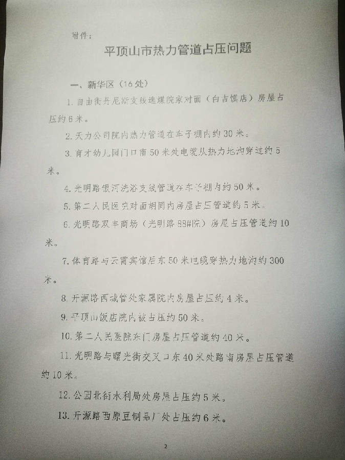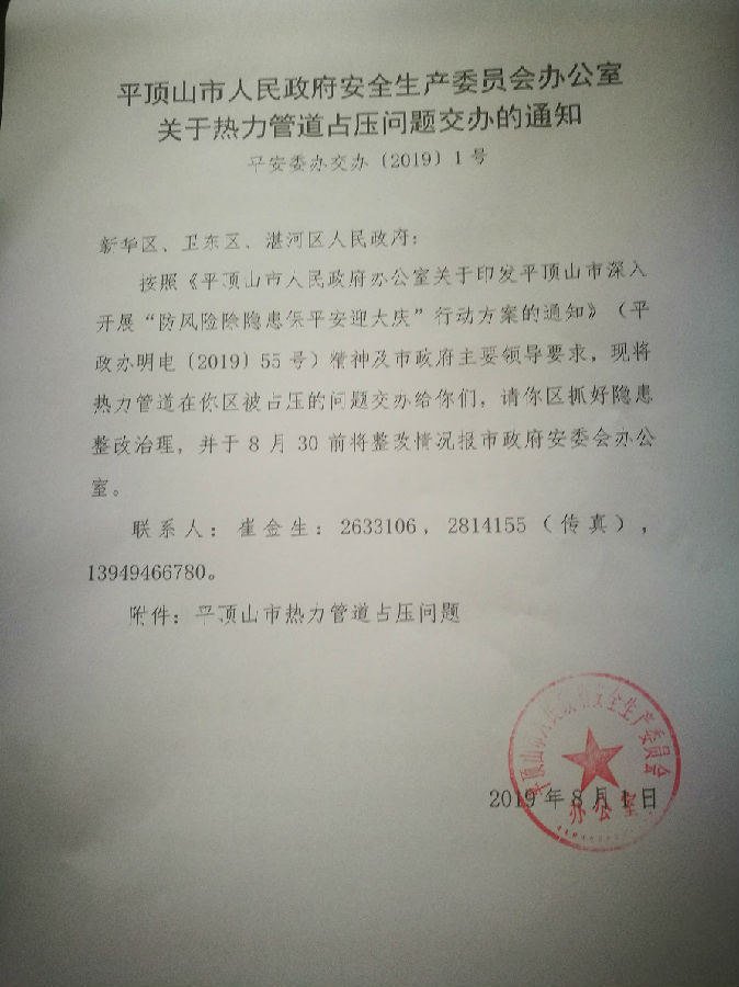 平顶山市人民政府安全生产委员会办公室关于热力管道占压问题交办的通知